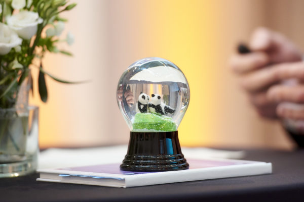 Die Lieblingstiere von Dónal Kinsella von Eaton Vance sind Panda Bären. So bekam er Barbara Bertolini eine Schneekugel von den Wiener Werktstätten mit Panda Bären